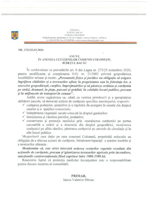În atenția cetățenilor comunei Colonești- rugăminte demarare acțiuni de curățenie specifice anotimpului